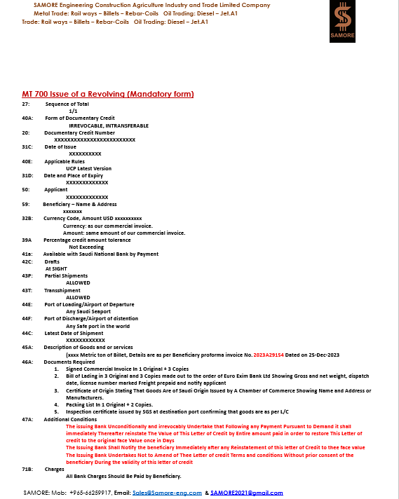 - Buyer Issue a revolving, irrevocable confirmed, insight MT700/MT760 with bank guarantee for full quantity
