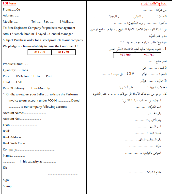 b. A Receipt of proforma invoice fees (Purchase seriousness fees (5000SAR I million ton (it is refunded after MT700) - After receiving of theup mentioned documents, Free Engineers shall mail the 2documents to (Main Seller)